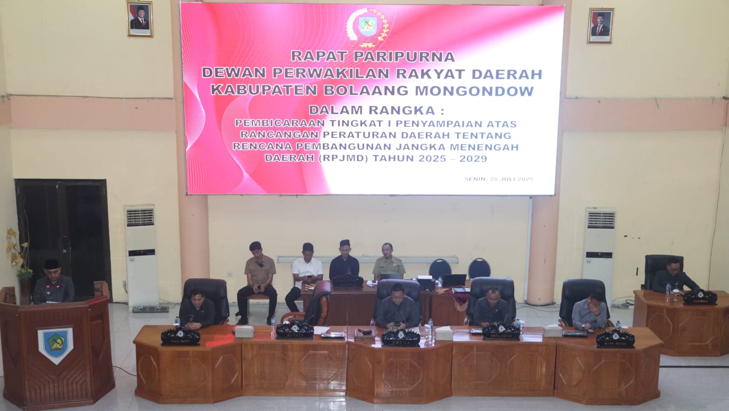 BOLMONG – Dewan Perwakilan Rakyat Daerah (DPRD) Kabupaten Bolaang Mongondow (Bolmong) menggelar rapat paripurna dalam rangka pembicaraan tingkat I penyampaian atas Rancangan Peranturan Daerah (Ranperda) tentang Rencana Pembangunan Jangka Menengah Daerah (RPJMD) tahun 2025 – 2029, Senin 28 Juli 2025.
