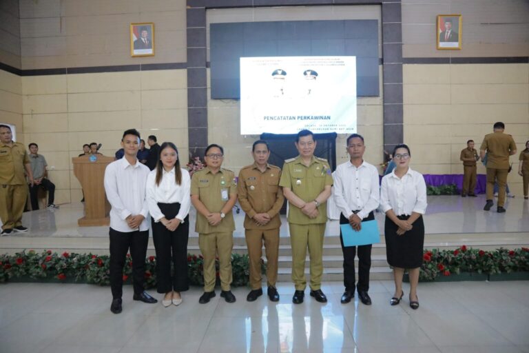 KOTAMOBAGU- Wakil Gubernur Sulawesi Utara, Dr. J. Victor Mailangkay, SH, MH, bersama Wali Kota Kotamobagu, dr. Weny Gaib, Sp.M, menghadiri sekaligus menjadi saksi dalam kegiatan Pencatatan Perkawinan Massal yang digelar Pemerintah Provinsi Sulawesi Utara melalui Dinas Kependudukan dan Pencatatan Sipil (Disdukcapil) Provinsi Sulut, Selasa (14/10/2025).